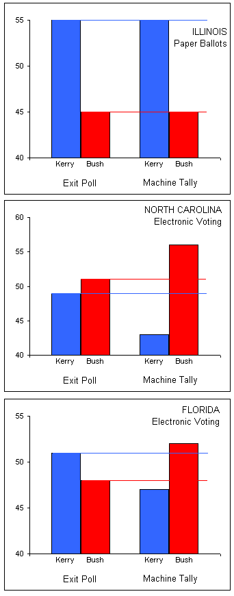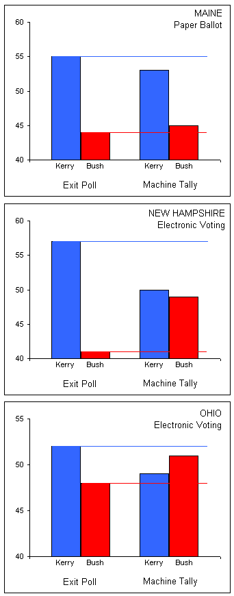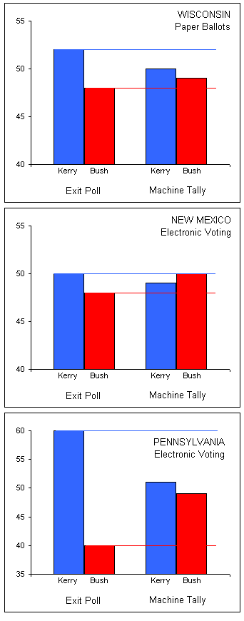 Par contre, partout où les Américains ont voté avec des machines à voter sans contrôle papier, les résultats des décomptes finaux étaient radicalement différents de ce que disaient les sondages sortie des urnes. Et toujours dans un sens favorable à G. W. Bush !
