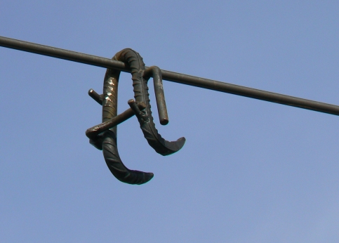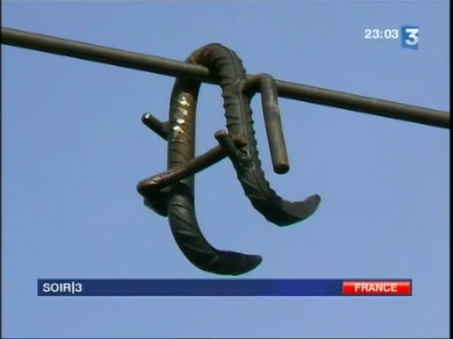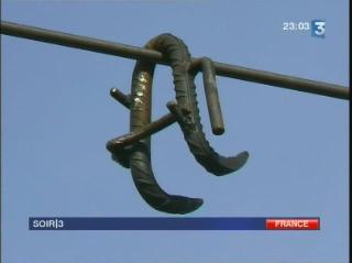 Sabotage SNCF : Je ne suis pas expert à la SNCF, mais je suis très bricoleur. Cette pièce mise sur les caténaires, c'est du grand art : la tige sur l'un des côtés du A, et parallèle à celui-ci, sert à mettre la pièce en place à l'aide d'une perche isolante. La petite tige sur l'autre coté, et qui lui est perpendiculaire, sert de butée d'arrêt pour la pièce pivotante, celle qui forme la barre horizontale du A. Cette pièce pivotante est faite pour empêcher le tout de tomber avec les vibrations. Les deux crochets en bas du A sont là pour s'accrocher au pantographe du train. Voilà pour ma vision personnelle de cette très belle pièce très bien pensée. Pour la mise en place, il suffit d'avoir une tige isolante pas facile à trouver. On met la pièce sur la tige et on la pose délicatement sur la caténaire, les crochets dans le sens d'arrivée du train, c'est mieux. La tige pivotante se referme, le tour est joué en moins de deux minutes. Cette pièce est faite uniquement pour détruire une partie de la ligne. Le train accroche la pièce et la fait se déplacer sur les caténaires, pour détruire les attaches et faire tomber ledit caténaire. Ce n'est que pour de la destruction. Si le but avait seulement été d'arrêter les trains, il aurait suffi de jeter depuis un pont une chaîne assez longue pour quelle touche à la fois le caténaire et le sol pour faire disjoncter le réseau. Bon