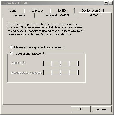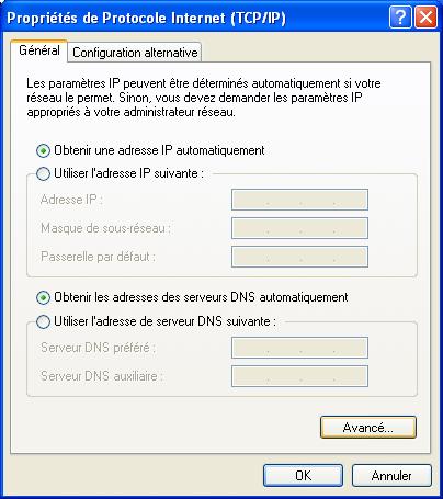 * Utiliser l'ascenseur pour trouver « Protocole Internet TCP/IP » et double-cliquer dessus ; ou bien le sélectionner et cliquer sur le bouton « Propriétés ». Vous obtenez :