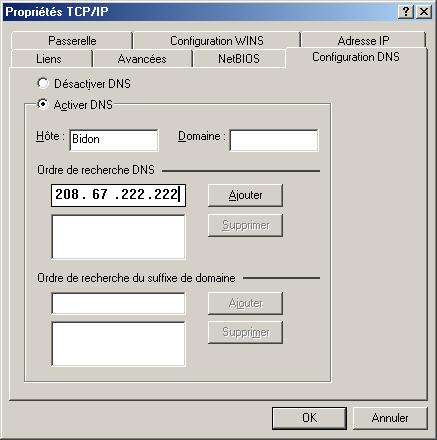 7°) Juste en dessous de « Ordre de recherche DNS » et juste à gauche du bouton « Ajouter », dans le cadre muni de 3 gros points, écrire la première DNS d'Opendns afin d'obtenir ceci :