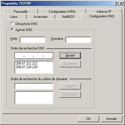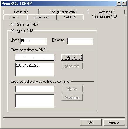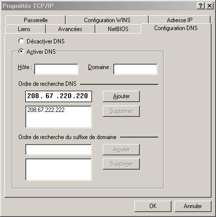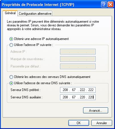 Voici leurs DNS : 208.67.222.222 et 208.67.220.220