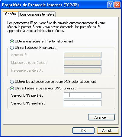 * Cliquer sur « Utiliser l'adresse de serveur DNS suivante » :