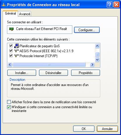 * Double cliquer sur "Connexion au réseau local" pour obtenir le panneau :