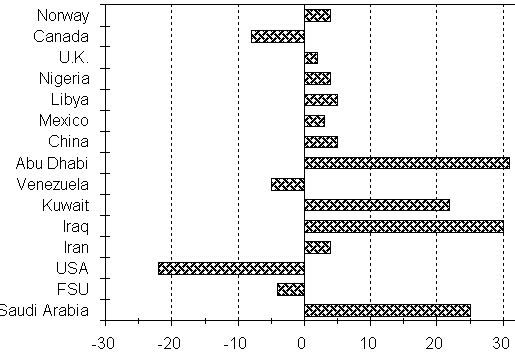 Ceci est l'image composite globale. Pour mieux comprendre ce qui se passe, nous devons comparer différentes régions productrices. En faisant ceci nous allons voir, qu'à l'exception du proche-orient et du bassin de la mer Caspienne, le reste du monde a déjà eu son maximum, et que la plupart des régions productrices sont maintenant en déclin. Les régions du proche-orient et de la mer Caspienne ne sont pas attendues à avoir leur pointe de production avant les quelques années à venir. Avec le passage du temps, tous les pays vont rivaliser les unes avec les autres pour le pétrole de ces régions. Et celui qui contrôlera la production de pétrole du proche-orient et de la Caspienne va contrôler le monde.7