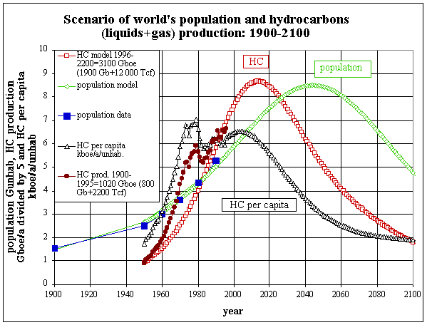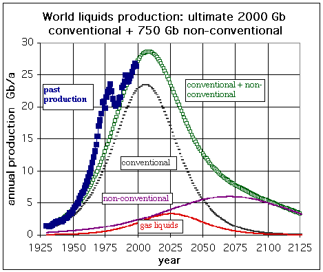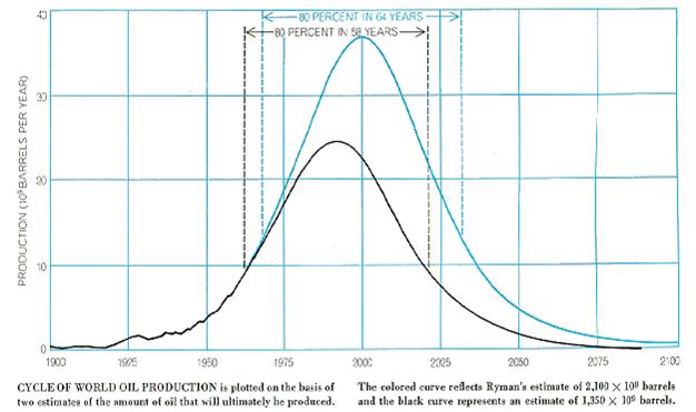 Des courbes de production globale ont aussi existé depuis ,,les années 60. Elles ont été raffinées chaque fois que les données sur les ressources en pétrole étaient révisées; toutefois la distribution et la durée ont peu varié à travers les ans. La production globale de pétrole a été maximum au début cette année et va commencé de décliner dans quelques 5 années. La production va pointer à un maximum de 90 million de barils par jours; cependant la demande est de 75 million de barils par jour à l'heure actuelle et va augmenter de 2,5% par année jusqu'à 100 million de barils par jour en 2010.6