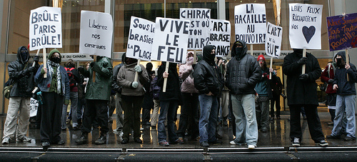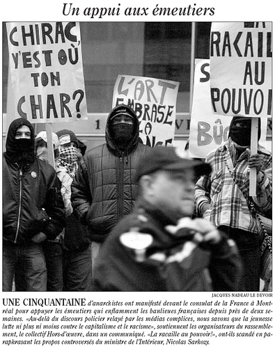 Le piquetage d'appui aux émeutiers en France que nous avons organisé ce mercredi à Montréal s'est avéré un franc succès. Avec seulement deux jours d'information via Internet, la mobilisation d'une cinquantaine d'anarchistes a dépassé toutes nos attentes.