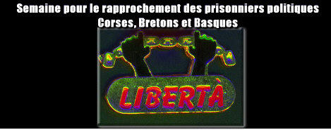 Mais je voulais vous dire aussi : quand vous serez dans cette manifestation, ce serait sympa d'avoir aussi une pensée et donc quelques slogans et quelques tracts pour les bretons, les corses et les basques qui sont en prison dans notre beau pays de fRANCE pour la seule et unique raison qu'ils en avaient marre que leurs peuples n'aient pas le droit de disposer d'eux mêmes ! Les corses de la prison de la Santé à Paris et ceux de la prison des Beaumettes à Marseilles sont en grève de la faim depuis plusieurs jours. Le prisonnier breton Gaël Roblin vient d'arrêter sa grève de la faim au bout d'un mois et un autre breton en prison, Gérard BERNARD a entamé une grève de la faim le 1er novembre.