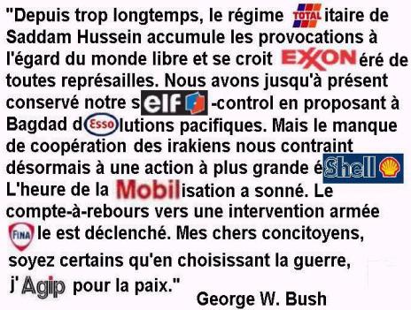 Plus personne ne croit que les USA vont faire la guerre en Irak pour y établir la démocratie. Car, même si les chefs des Américains prétendent que les USA sont un modèle de démocratie, tout le monde sait très bien que c'est faux : si, habituellement, le dictateur d'un monde de six milliards d'habitants (le président des USA) est élu par les quelques centaines de millions d'étasuniens, cette fois-ci, l'actuel président des États-Unis (et dictateur du monde) est celui qui a perdu les élections américaines ; il a en fait été désigné par cinq voix contre quatre au sein d'une espèce de conseil d'État ! Et, si ce n'était pas suffisant comme démonstration, il n'y aurait qu'à constater que presque personne ne veut de guerre en Irak, même au sein des États-Unis, et que, pourtant, ces derniers vont quand même commencer leur guerre très bientôt ! Si c'est ça la démocratie, je me demande ce qu'est le fascisme ! Les États-Unis, et donc le monde, sont actuellement dirigés par une bande de fous extrêmement dangereux. Se mettre à plat ventre devant eux serait un suicide. Ce serait un nouveau "Munich" !